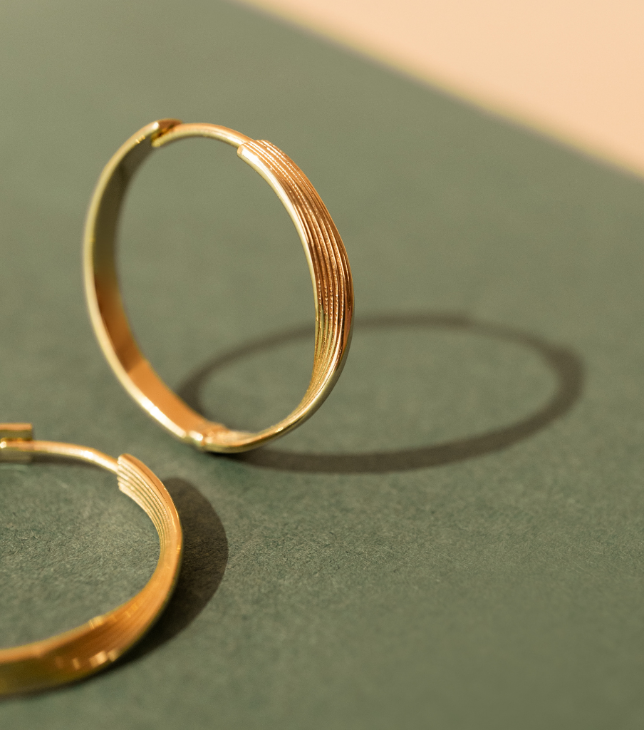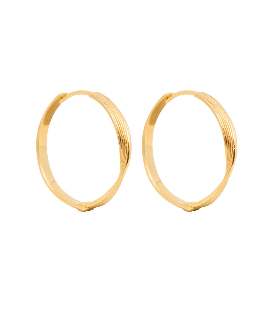 Deze oorbellen hebben een opvallende draai en verticaal subtiel streep design. Ook in kleinere versie beschikbaar. Leuk om te combineren met onze andere click oorbellen.